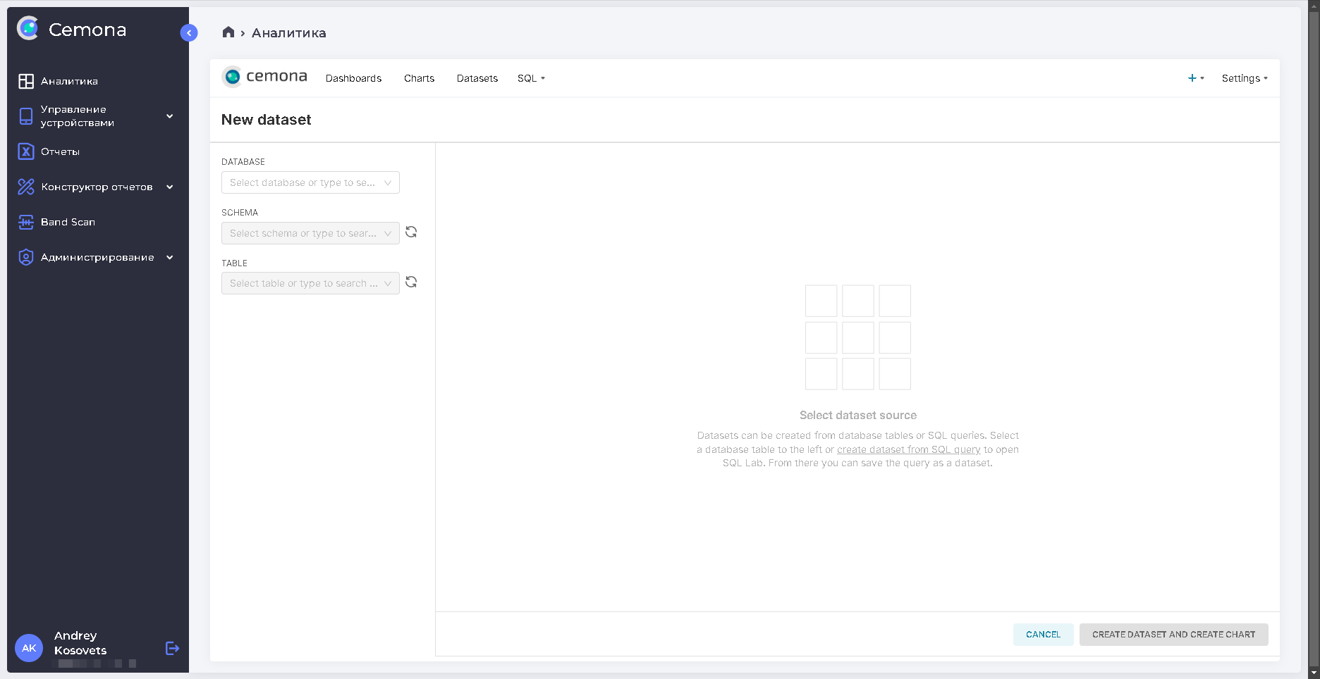 Выбрать необходимые поля: database, schema, table, создать набор данных и перейти к созданию визуализации: «Create dataset and create chart»